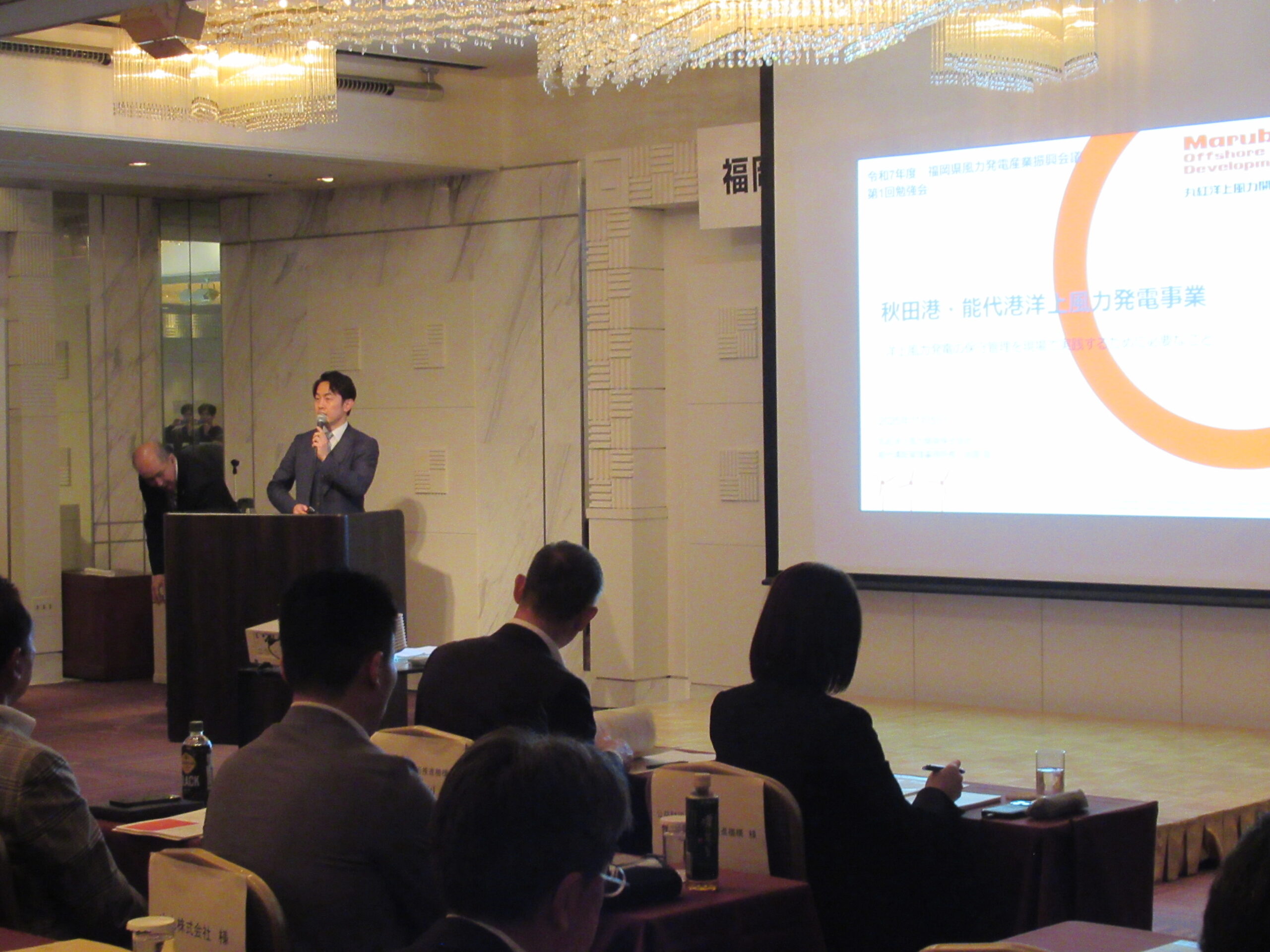 勉強会では、丸紅洋上風力開発株式会社の佐藤様にご登壇いただき、洋上風力発電産業の人材育成に関する取組事例をご紹介したほか、本会議における人材育成事業の取組紹介を行い、本会議が実施する人材育成講座受講料補助金の対象事業を各実施団体からご紹介しました。また、北九州市におけるO&Mの取組についてもご紹介し、約110名の方にご参加いただきました。